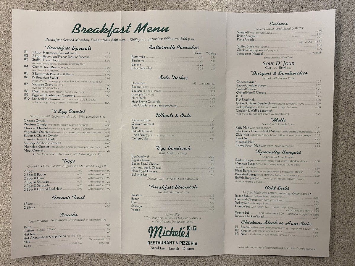 The menu at Michele's OIP Restaurant & Pizzeria offers a comforting mix of classic family-friendly dishes and familiar favorites, reflecting the casual and welcoming atmosphere of a neighborhood spot. Whether you’re stopping by for a hearty breakfast or settling in for a relaxed dinner, the selections are straightforward and satisfying.